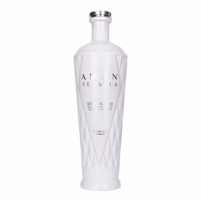 Here we have the magnificent Tequila Reposado, from Aman. It’s made in Nayarit, Mexico, using 100% pure agave. The crop is put through a roller mill, fermented in stainless steel, distilled in copper, and aged for six months in a combination of French and American oak barrels.