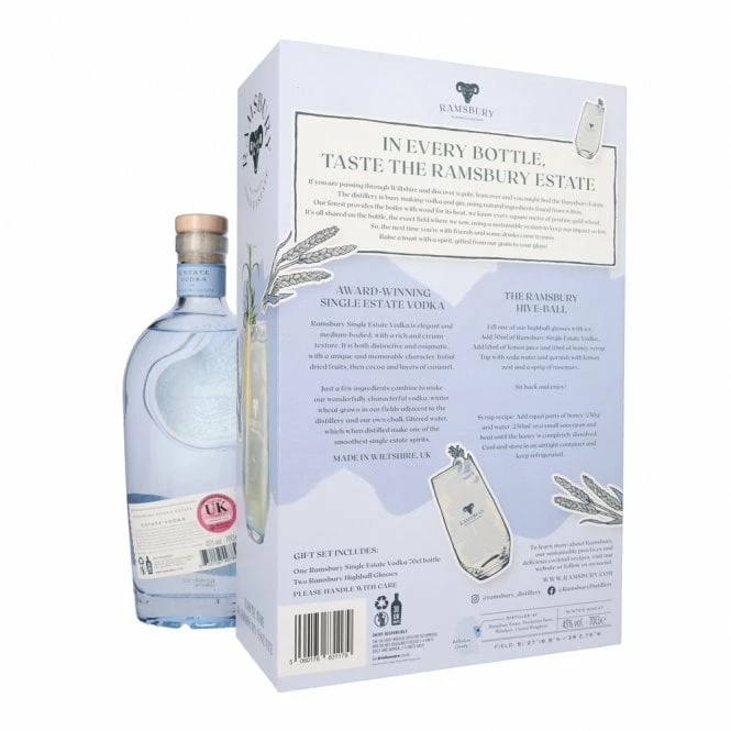 Here we have a bottle of Single Estate Vodka from Ramsbury Brewery in Wiltshire. Included here are two highball glasses, made from blue-tinted recyclable glass. Just add a few ice cubes, and your mixer of choice.